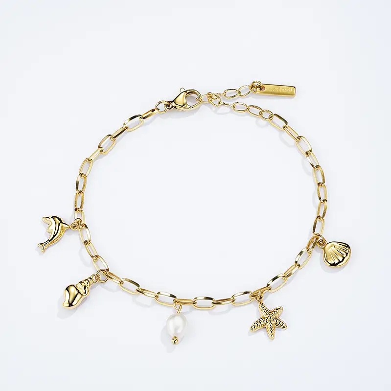 Bracelet breloques coquillages en acier inoxydable. Résiste à l’eau et ne noircit pas. Garantie sans nickel, sans cadmium, sans sel de plomb.