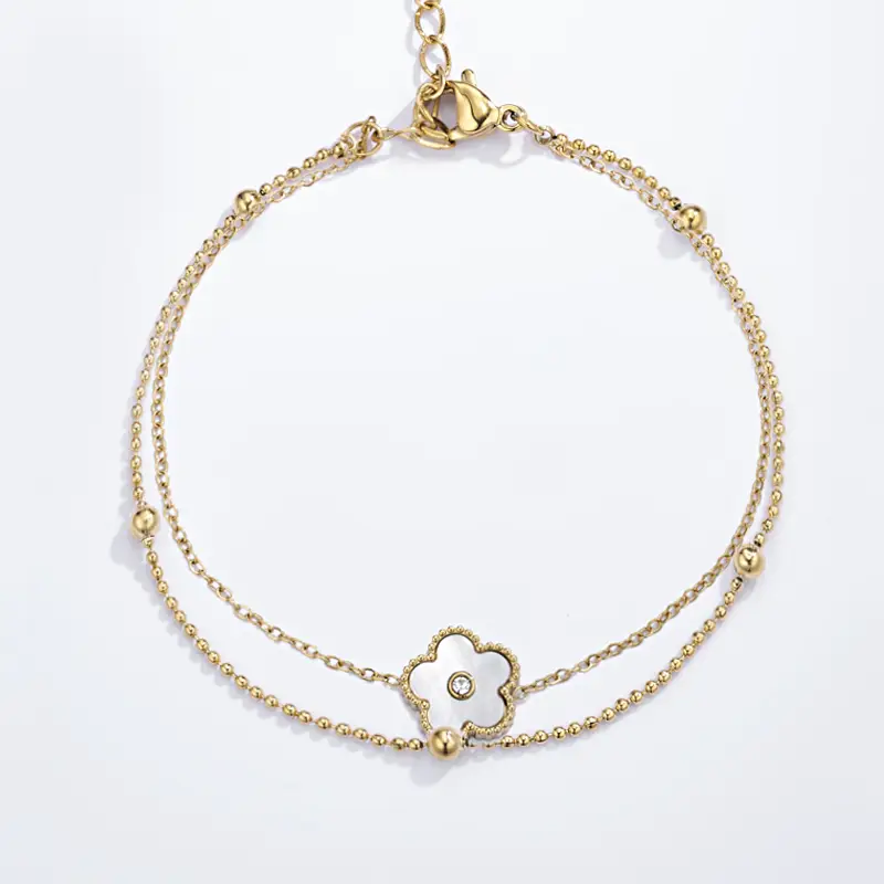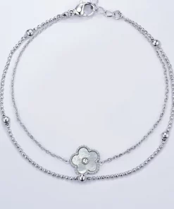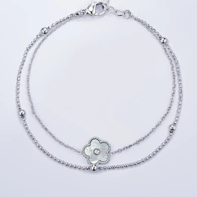 Bracelet double fleur blanc en acier inoxydable. Résiste à l’eau et ne noircit pas. Garantie sans nickel, sans cadmium, sans sel de plomb.