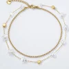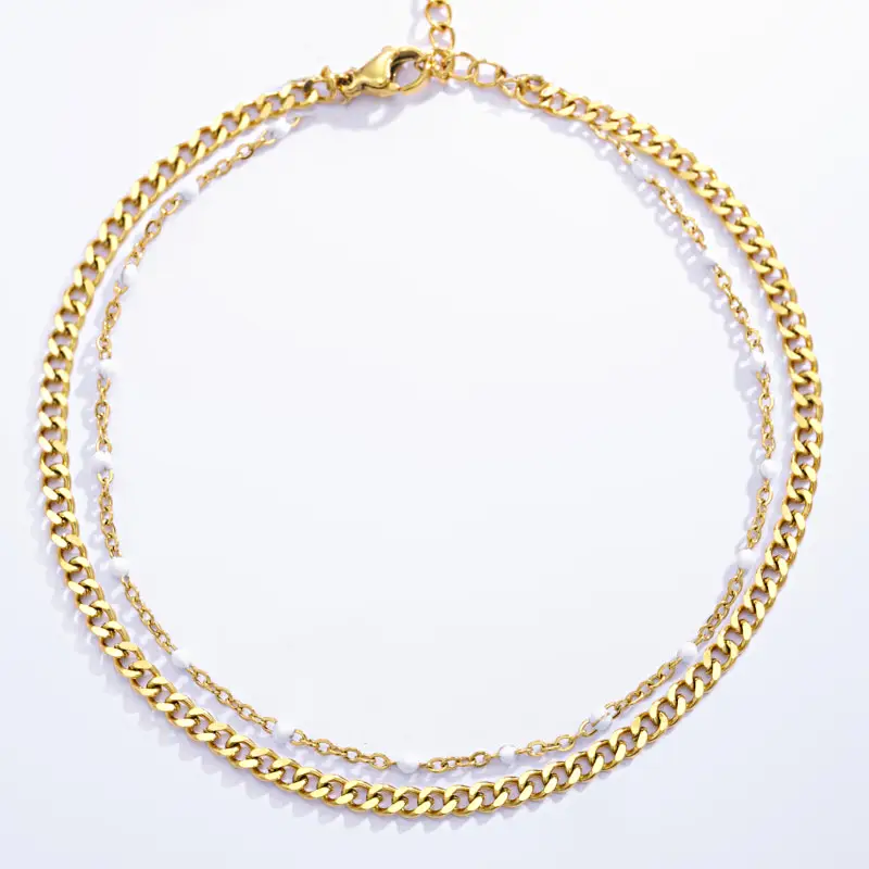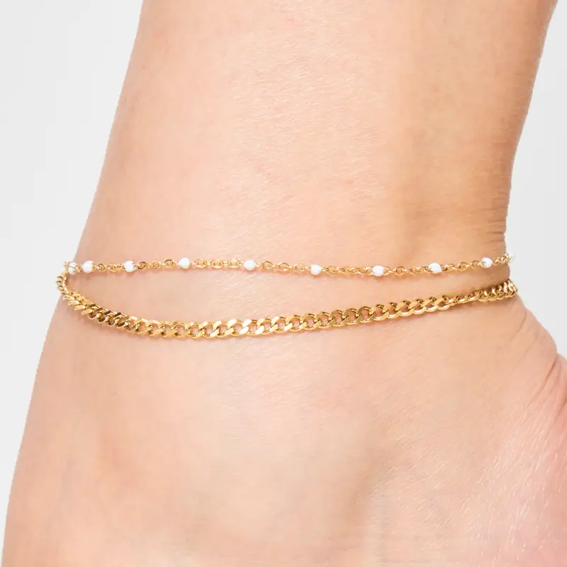 Chaînes de cheville double pierre blanche en acier inoxydable. Résiste à l’eau et ne noircit pas. Garantie sans nickel, sans cadmium, sans sel de plomb.