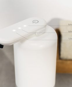 - Bouton tactile, capteur sans contact Touch Free : ce distributeur de savon rechargeable est doté d’un bouton tactile qui permet de l’allumer, de l’éteindre et de changer de mode. Grâce à son capteur, il distribue le savon facilement lorsque vous approchez vos mains de la sortie de savon, sans qu’un contact ne soit nécessaire, évitant ainsi de salir le lavabo ou de laisser des traces.